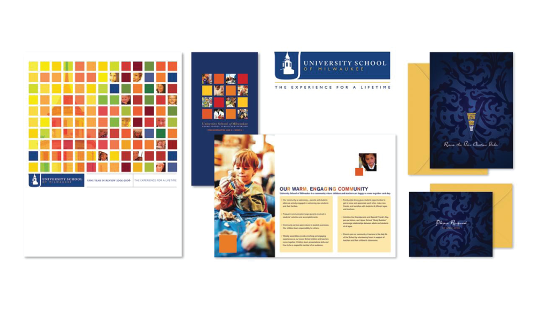 CLIENT: University School of Milwaukee | logo & identity design, reports, newsletters, curriculum map and event collateral